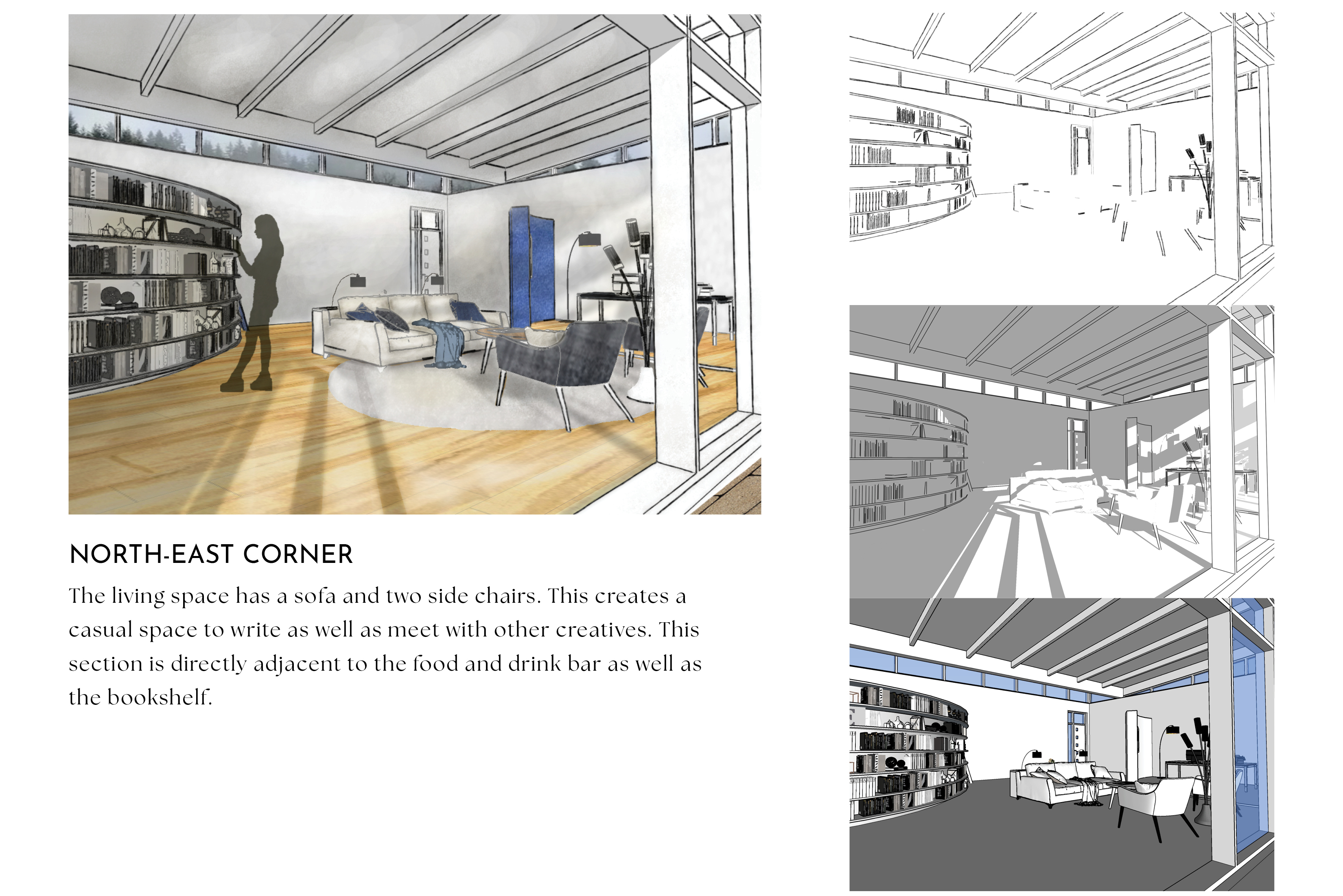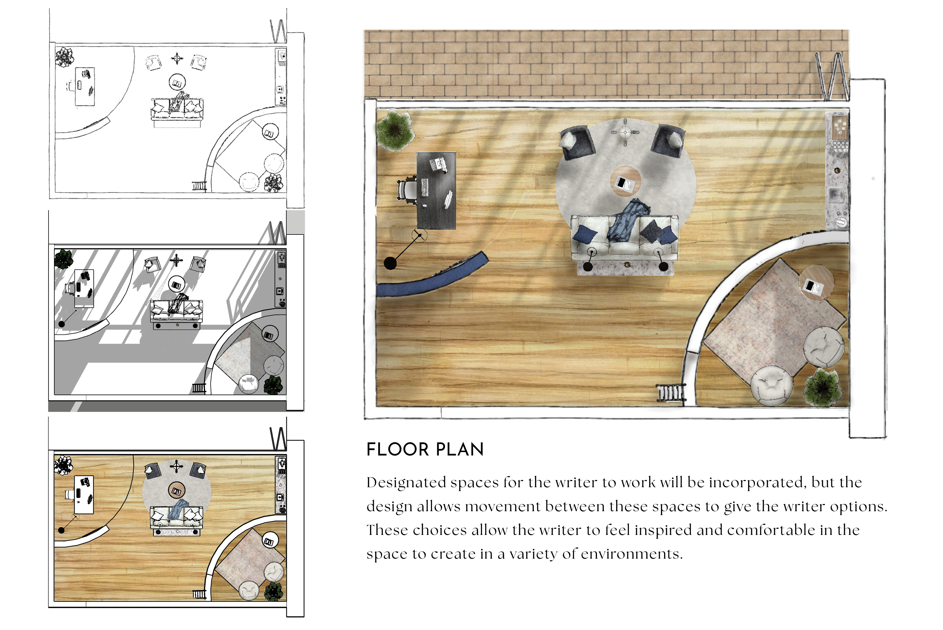 creative refuge. This 1000 SF studio space is designed for a writer and their needs during a creative retreat. The goal of this retreat is to provide an efficient work studio where writers can confidently create their work while providing a sanctuary for rest and inspiration.