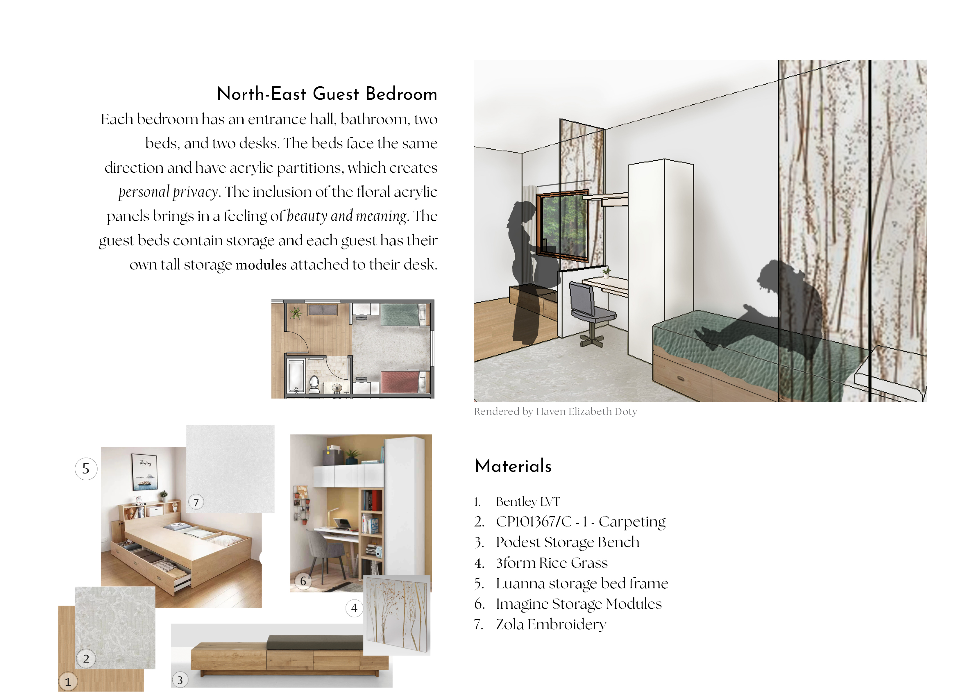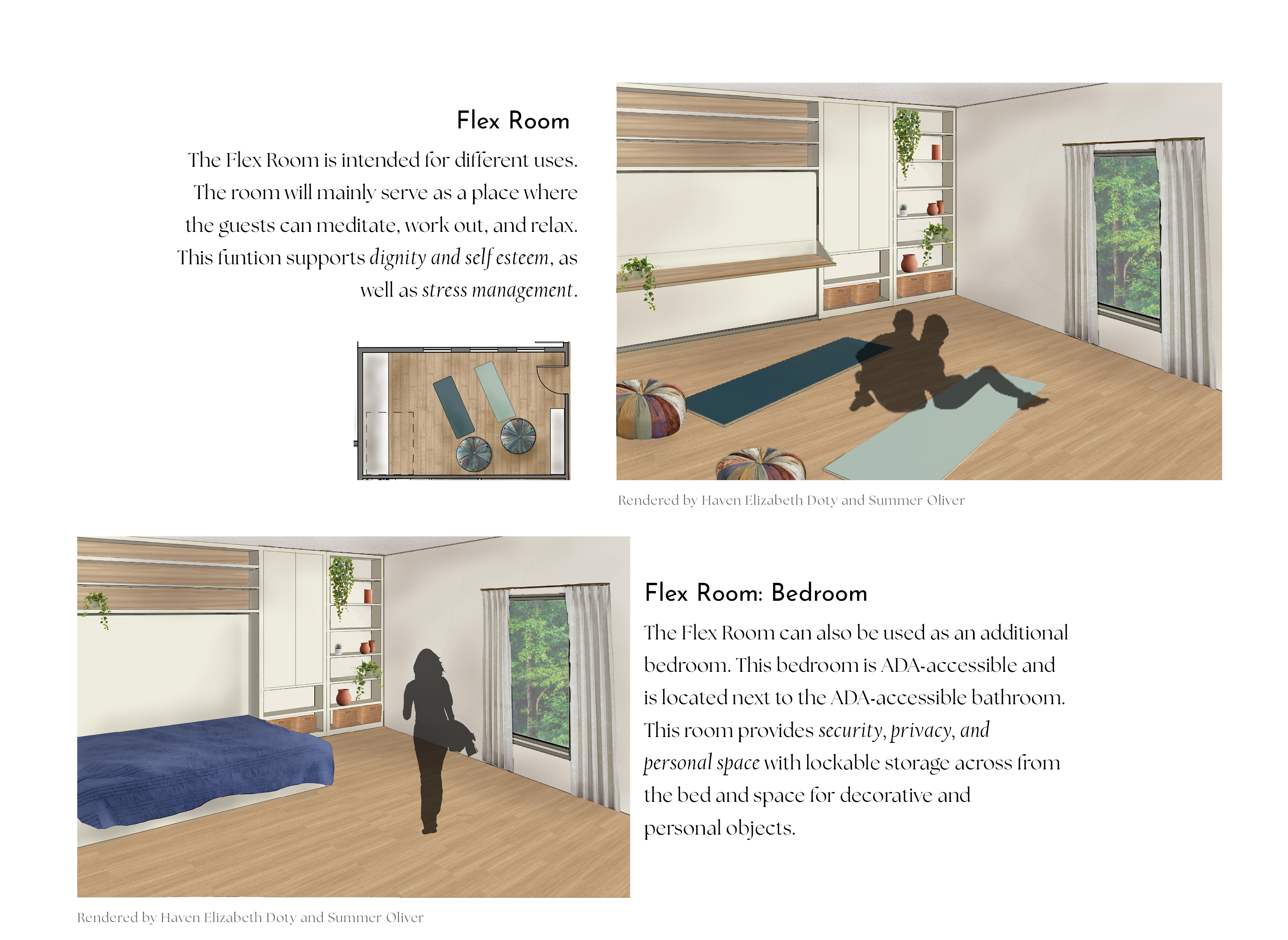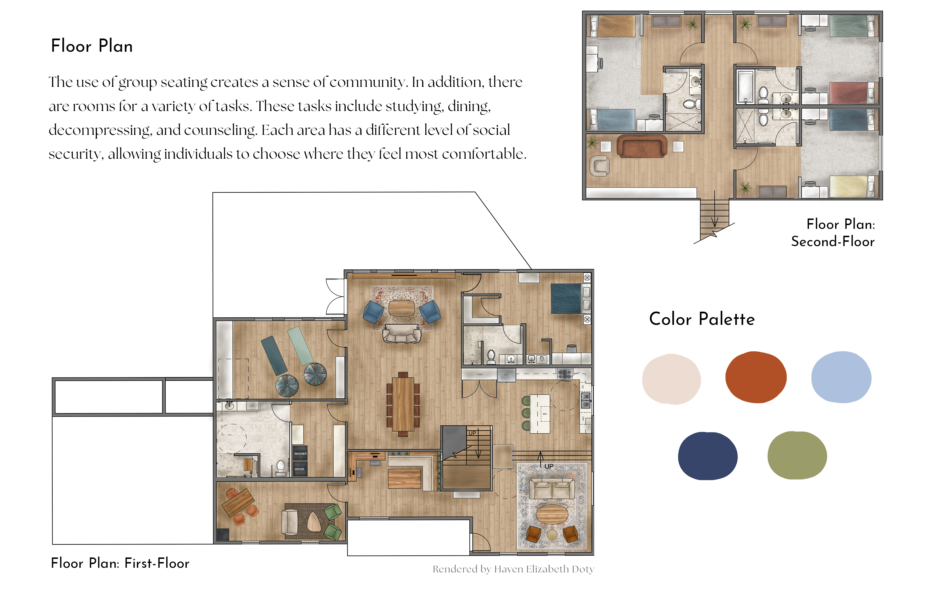 Around 25% of women have experienced domestic violence in their lifetime. Many of these are women ages 16- to 19-years-old. Often times these women face financial insecurity, lack of a safe living environment, and insufficient support. This project aims to address these issues and create an anti-violence shelter for young women ages 16 to 24 who have experienced domestic violence and are seeking safety and assistance. The goal is to incorporate principles of trauma-informed design to create a transitional home that promotes confidence, growth, and community.